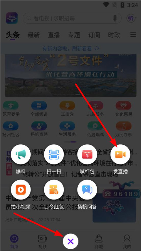 1、打开app,登录进入首页,用户可在首页查看扬州新闻、社区志愿服务、生活服务等,点击“+”,选择发直播;
