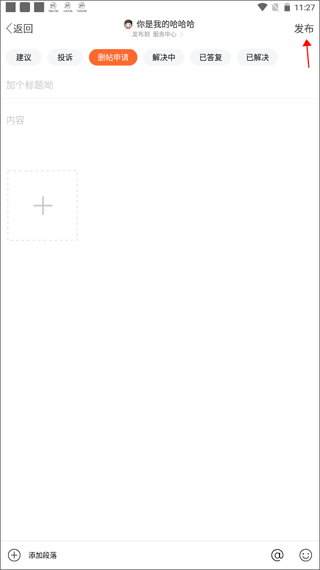 2、输入标题和相关内容,填好删帖申请之后点击发布,系统看到后就会联系工作人员进行删帖操作。