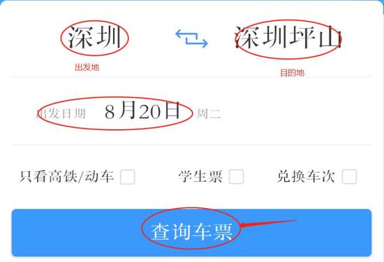 2.输入出发地、目的地、出发时间,点击“查询车票”。