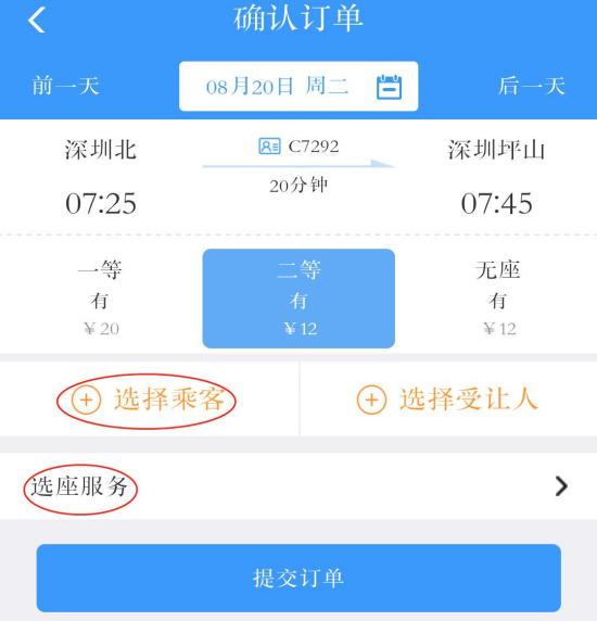 3.点击搭乘的列车,点击“选择乘客”选择乘车人后提交订单。