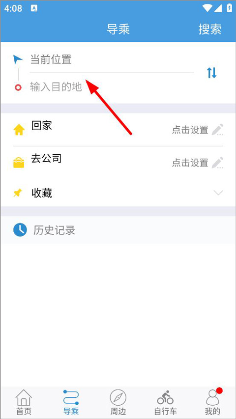 2、打开导乘页面,用户可输入当前位置和目的地搜索公交信息,也可以设置回家和去公司的路线;