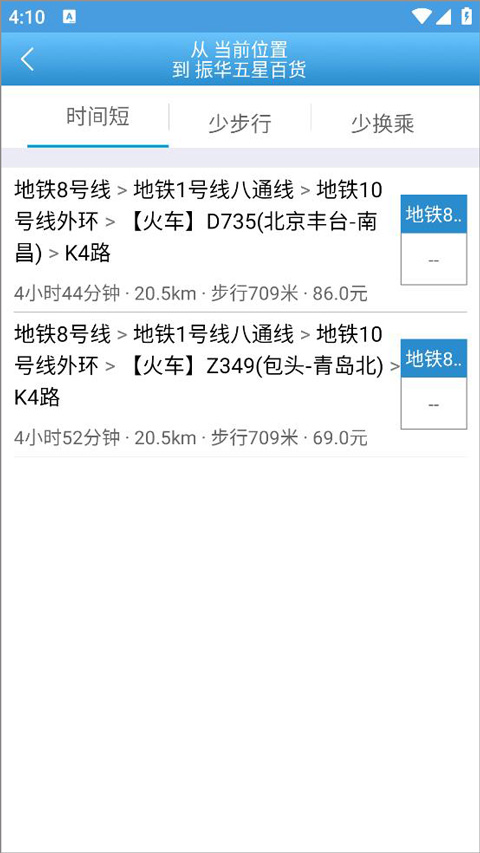 4、查询到的路线按照时间短、少步行和少换乘分类,用户选择自己合适的路线出发即可。