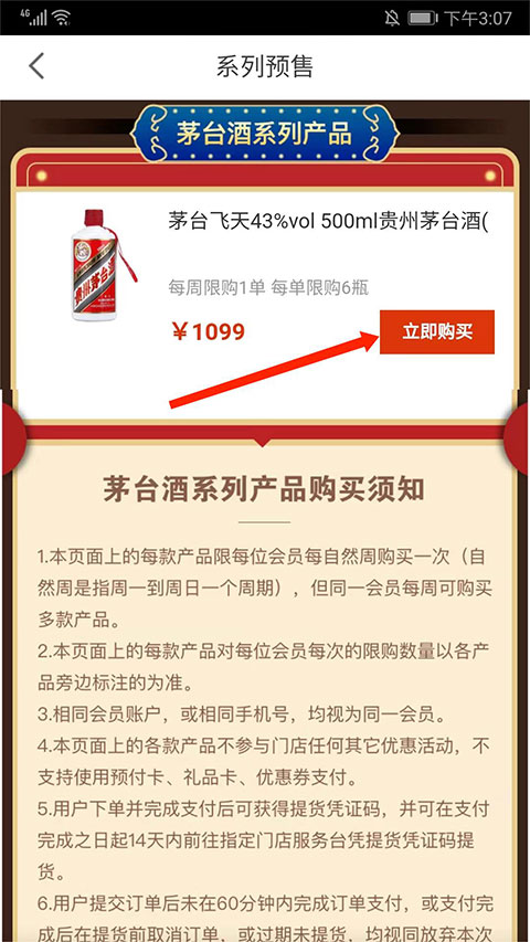 4、确认好茅台信息后,选择“立即购买”即可抢购茅台。