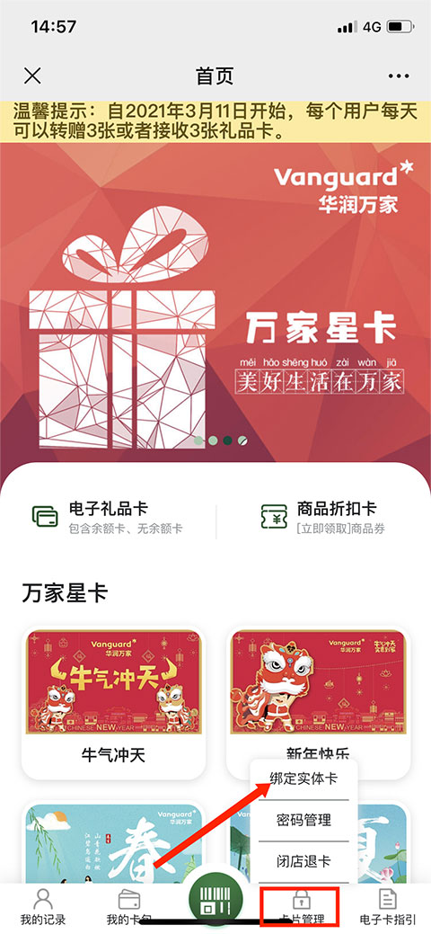 3、点击右下角“卡片管理”,然后选择“绑定实体卡”选项,