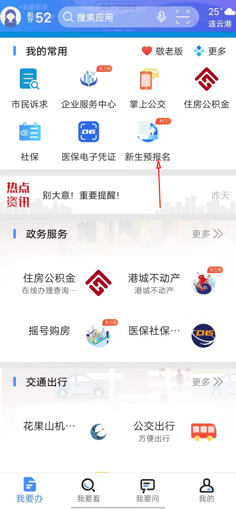 2、在我要办界面点击新生预报名。