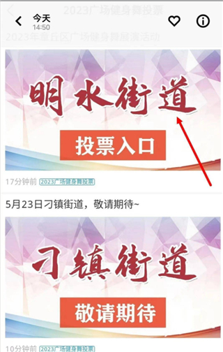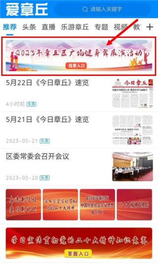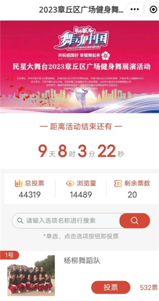 1、在首页找到章丘区广场健身舞展演活动投票入口;