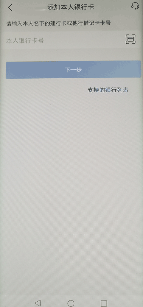 3、现在就在这里输入中国建设银行或其它借记卡的卡号,继续点击下一步选项;