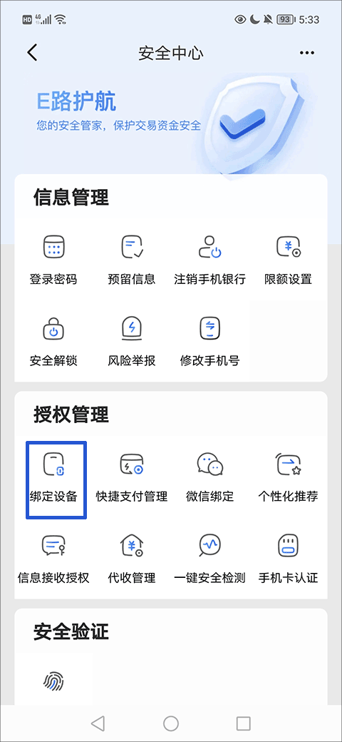 3、现在就可以在安全中心的授权管理一栏中找到并点击“绑定设备”选项;
