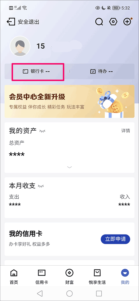 1、首先,打开软件,在软件我的界面找到并点击“银行卡--”一栏;