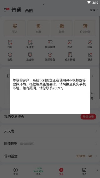 2、如果我们需要交易,点击“交易”任意菜单图像均可跳转到登入页面,或点击左上角的“人像头”,跳转到新的页面,点击“立即登录”字眼输入客户号均可以与密码均可登入。