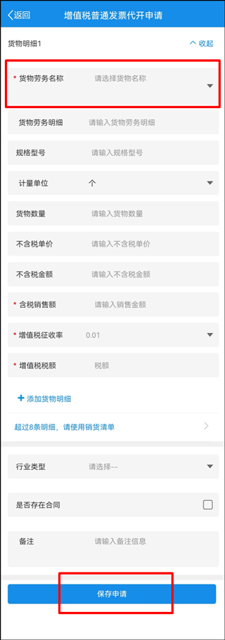 4、填写发票开具内容,点击【货物劳务名称】可通过搜索填写,填写完成成保存申请