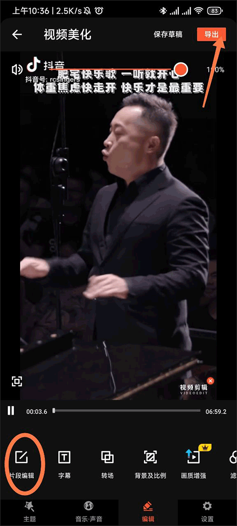 现在我们就可以看见我选中的3条视频以及统一成了一条6分59秒的视频了,这个时候我们可以通过编辑区域的片段编辑进行删减,等拼接好了之后,点击右上角的“√”确认,如何导出来就可以了。