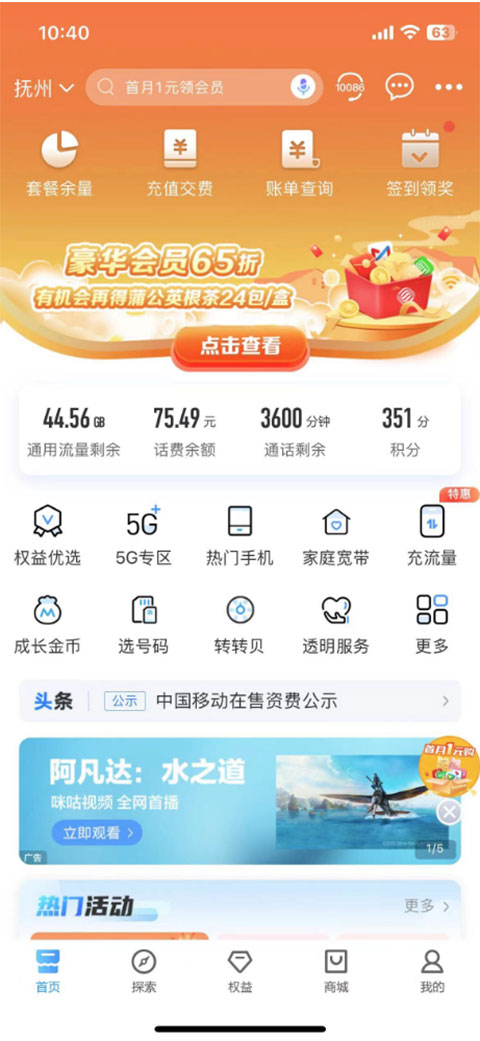 4、畅游移动商城:轻松办理4G套餐、移动数据业务、流量包等业务,多种时尚终端、配件选购,轻松享受一键办理,畅享移动“心”体验;