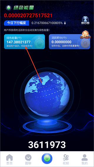 1、一个圈圈app就是通过看商家广告,以及拉新等方式来进行赚钱的,用户可以进入软件后点击底部中间的绿色能量图标,然后依次点击积分图标,观看视频完成任务