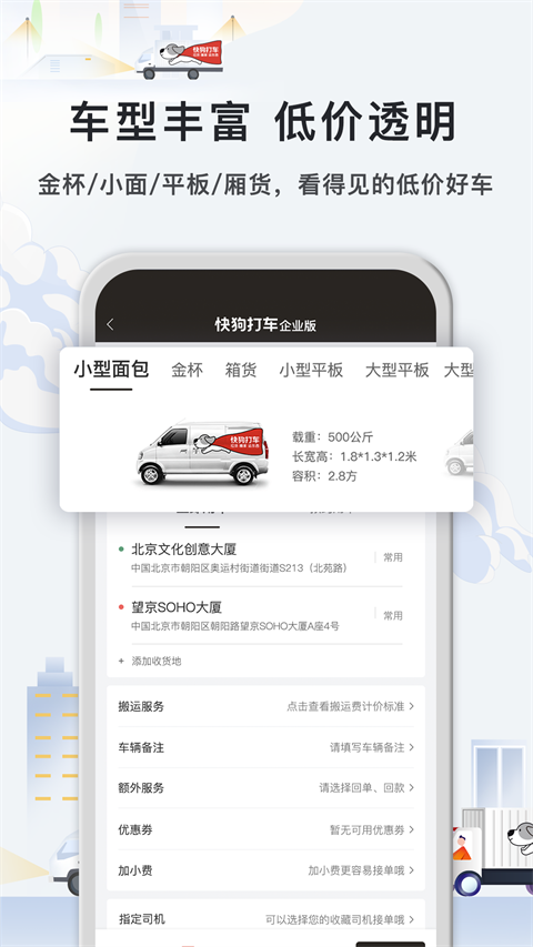 快狗打车企业版app可提供小面、金杯、厢货、皮卡、依维柯、平板、冷藏、高栏、半挂等多种车型,更有数十万名优质司机等您选择。