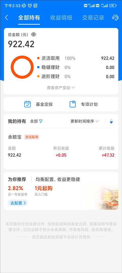 3、用户使用一个账号,即可在平台上进行余额宝、存金宝、基金等各类理财投资