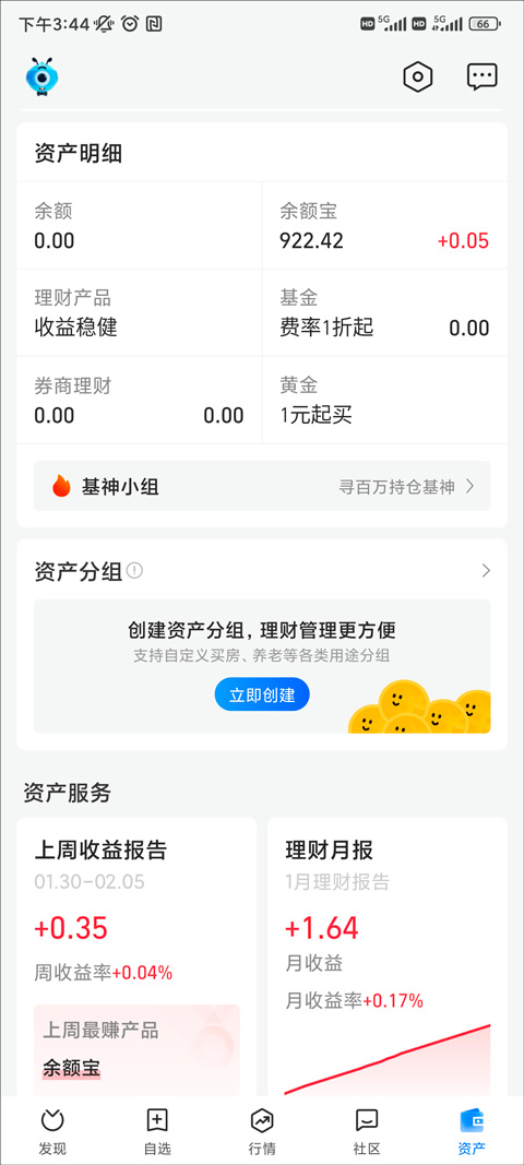 资产结构简单明了,每日收益一目了然,支持自定义创建资产分组,资产管理更清晰。