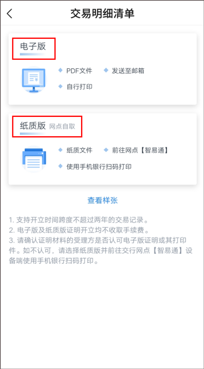 纸质:前往网点【智易通】设备端使用手机银行扫码打印