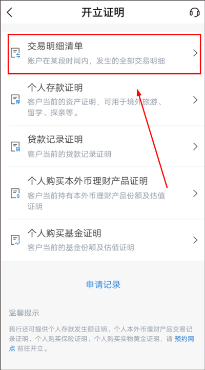 2、进入【开立证明】页面,用户点击【交易明细清单】即可进入交易明细清单查询页面。