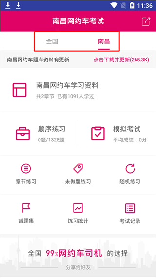 1、下载安装好本站提供的南昌网约车考试安卓版软件后即可运行,其中提供了全国和南昌的题库;