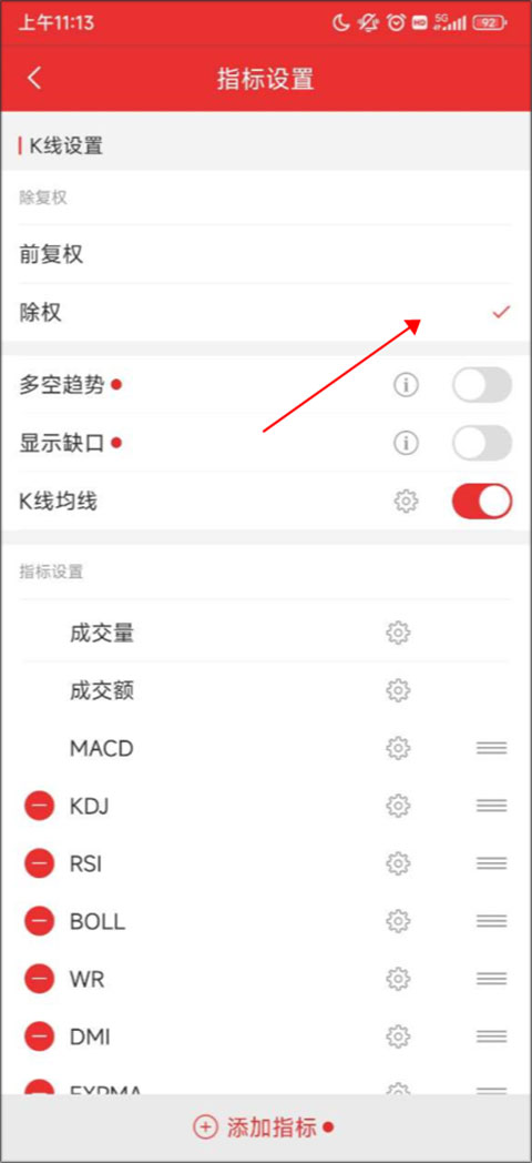 3、进入之后,点击“除权”,右侧出现“勾”即可。