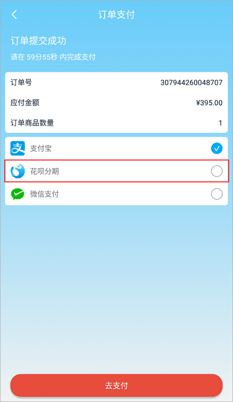 2、接着在付款界面选择“花呗分期”即可分期付款了。