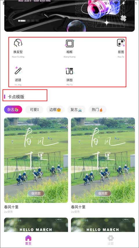 1、打开app并默认进入到【首页】以后,你会看到有很多的功能按钮,包含换发型、相框、抠图、滤镜等,下面还有很多还用的卡点模板。