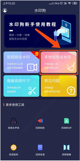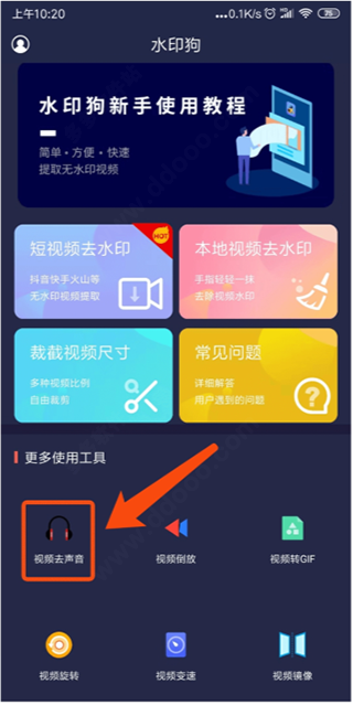 1、打开水印狗app,进入首页,点击进入“视频去声音”功能模板;