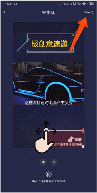 3、用手机画出视频中的水印区域,这时如果好奇水印狗去水印效果怎么样的可以点击“下一步”进入去除水印效果预览页面;