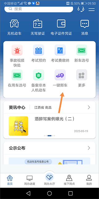 3、在网上车管所app上操作一键挪车的方式也很简单,用户登录app后即可在首页处看到这个功能