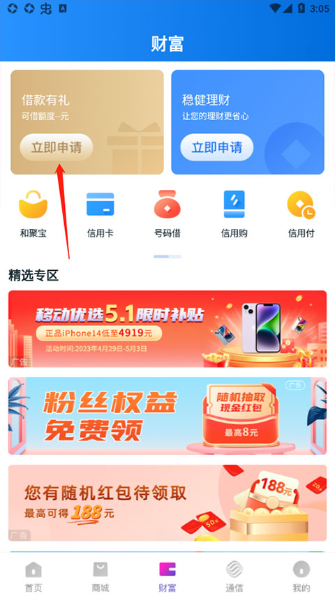 1、打开和包借钱app,进入首页点击“财富”。