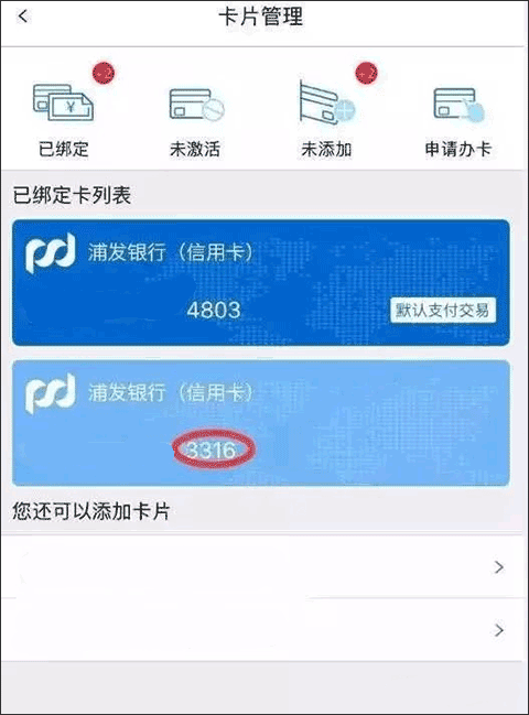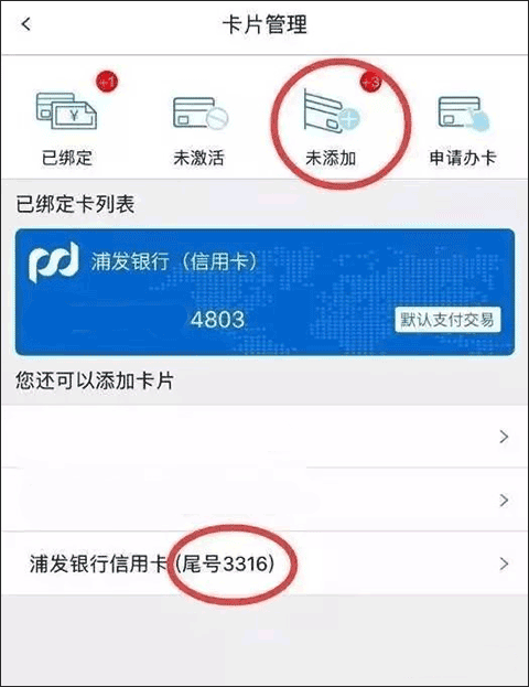 4、绑定卡片:点击”未添加”,再点击你想添加的卡号