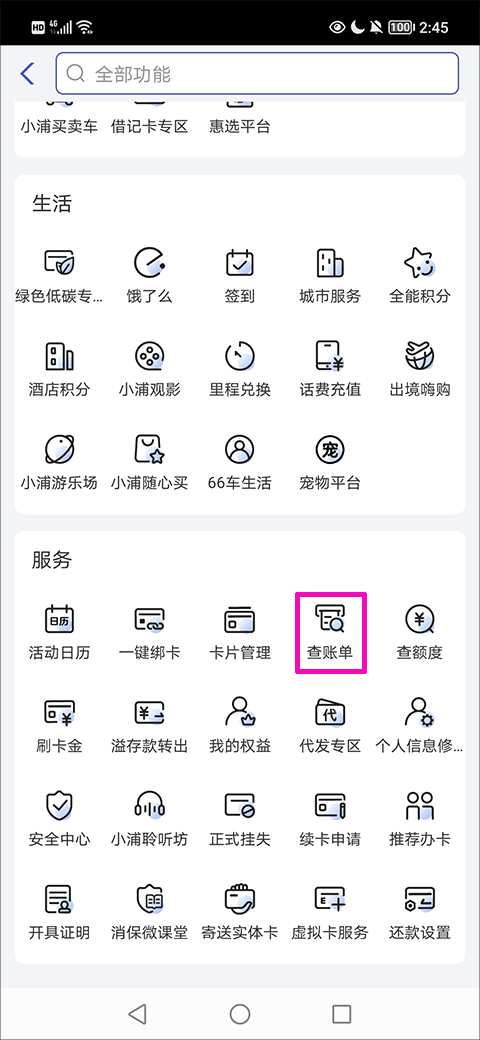 2、然后,在更多界面的服务一类中找到并点击“查账单”选项;