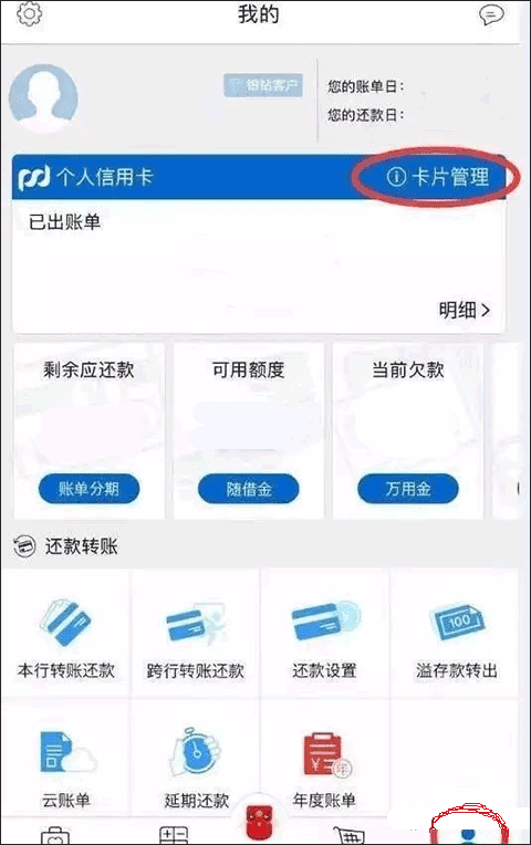 3、绑定卡片:点击”我的“,再点击”卡片管理“