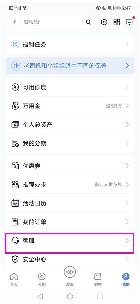 2、然后,在我的界面中找到并点击“客服”选项;