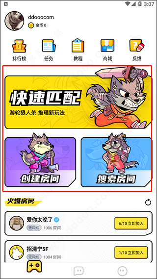 4、另外,在这里主要提供了快速匹配、创建房间、搜索房间多种组局方式,多人在线连麦,玩在一起,乐在一起。