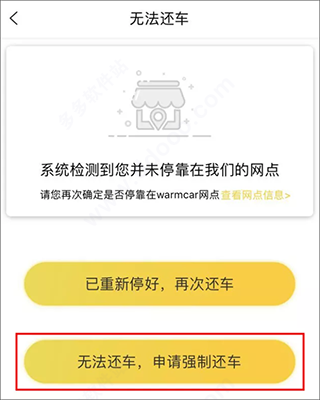 5、若您手机、车辆定位与预定网点不相同,导致无法正常还车,点击继续还车