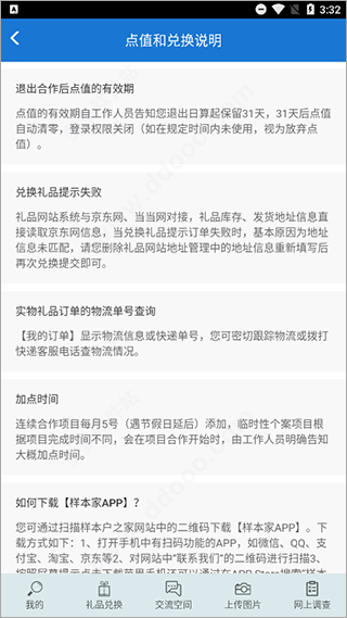 样本家app由央视市场研究部官方专们为广大样本户打造的手机调查软件,一般又称为央视样本户之家,虽然其中只有用户们提供了我的、礼品兑换、交流空间、上传图片、网上调查等五大模板功能,但是这也就是该软件的主要功能了,在这里只要用户根据系统的提示来完成了网上调查券和上传了自己样板房照片,那么就会获得积分,接着还能根据自己的积分来免费在线兑换礼品,从而更好的鼓励大家参与到调研中,发挥样本户更大的作用。另外,你可以可以将样本户之家app发现给他人进行下载使用,只要你成功的邀请到了新用户,那么你还能免费获得大量积分来进行兑换礼品使用,而且利用这些积分不仅可以兑换话费,还能兑换床上四件套、不粘炒锅、保温杯、鸳鸯锅、料理机、酸奶机等等商品,十分划算,欢迎有兴趣的自行下载体验。