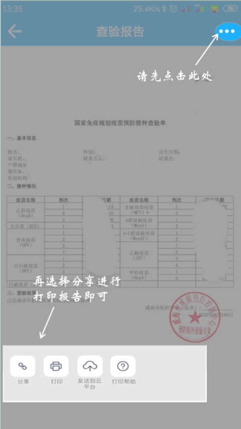 3、接着就可以匹配出已接种儿童的接种报告了,用户还可在该页面先点击右上角的扩展功能图标,然后再点击底部分享或打印进行生成查验报告