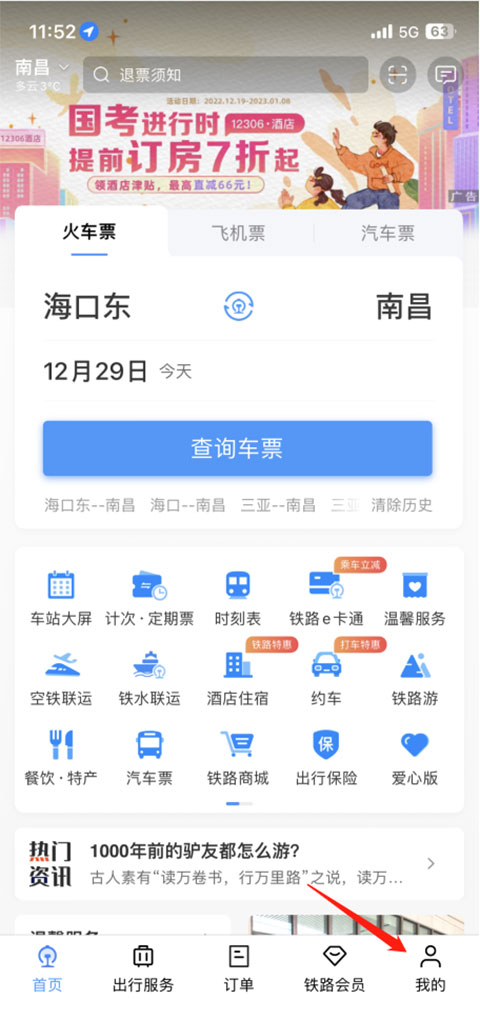 1、进入到了的铁路12306app的界面当中。点击右下角中的 我的 的选项。