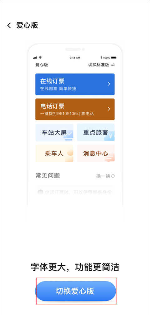 铁路12306爱心版是一款专为老年人准备的特殊版本,全称中国铁路12306爱心版,在该版本内所有的字体都会变得更大更粗,同时也精简了不少功能,从而让老年人可以更加方便的使用12306进行购票,也不用担心花里胡哨的界面,让老年人手足无措。而且该软件的购票过程也是平台中最简单的,多功能的查询能够支持你无障碍购票,同时还支持语音识别的功能,你只需要说话就能够完成整个购票,是非常暖心的一个版本。