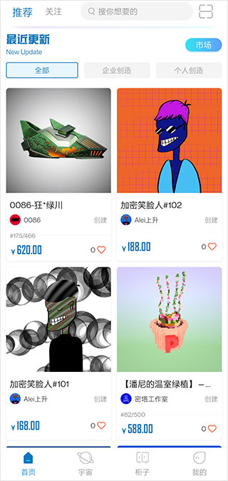 稀物app是由深圳市奇异火科技有限公司推出的一款创作购物平台,原名加密空间app,该平台内提供了海量的知名IP艺术品资源,大家能够在这里找到最适合自己的艺术品,并且可以用你手上收集的数字商品或数字IP创作出属于自己的艺术品,创造更多稀有有趣的资源,当然你也可以将自己的作品放在网络上售卖,说不定会有不少朋友喜欢你的艺术呢!此外软件内会有很多用户发布自己的作品,你觉得喜欢可以购买,也可以与他交流,分享经验,帮助自己找到创作灵感。另外加密空间app内还提供了抽盲盒功能,各种优秀的作品等你来领取,看看自己的运气如何,因此还在等什么?快来下载体验吧!