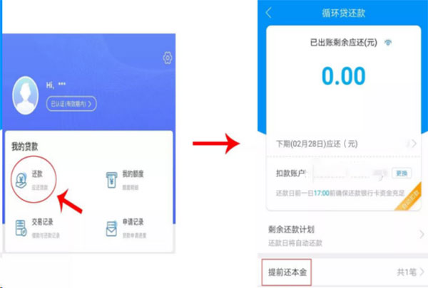首先登录中邮钱包进入“我的”-选择“还款”功能 ,如需提前还款,点击“提前还本金”。其次,支持多种还款方式,选择好还款方式后点击“立即还款”即可。