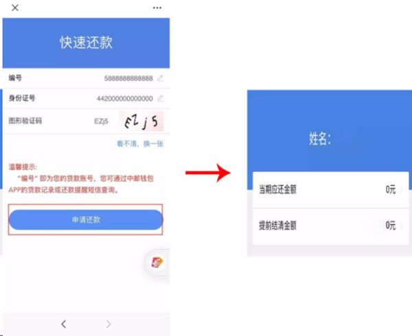 进入还款界面后,输入“贷款编号”、“身份证号码”以及“图形验证码”后点击“申请还款”。进入后个人便可以可选择“当期还款”或“提前结清”。