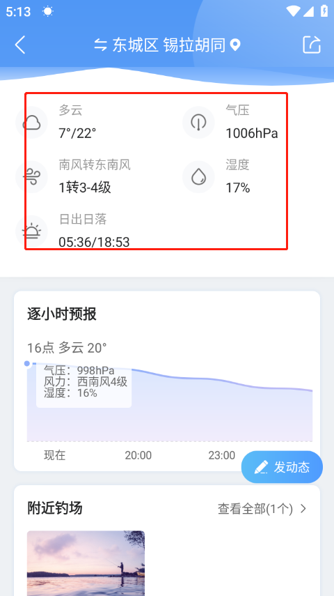 3、往下拉还可以看到气压为1006hPa,湿度为17%,综合这些参数可以得出该地区该时间段钓鱼上钩几率较低。对了,你们记得把定位调到你们自己钓鱼的区域。