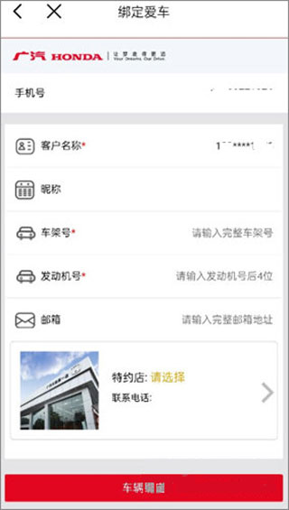 2、输入客户名称、昵称、车架号、发动机号、邮箱,选择特约店,点击【车辆绑定】即可。