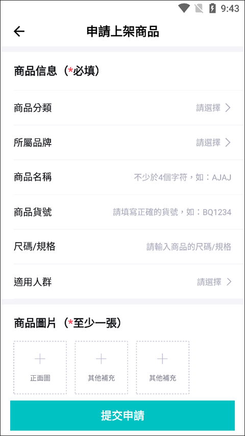 3、在申请新品页面点击申请上架商品,输入商品信息,点击提交申请即可。