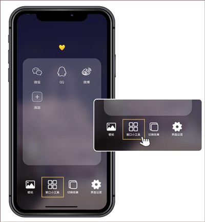 1、在手机桌面。上长按或双指捏合,选择小工具。