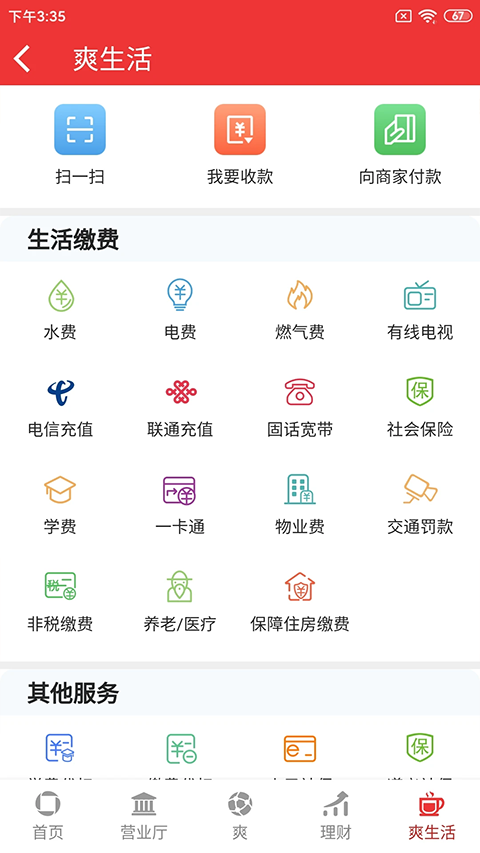 2、爽生活:“爽爽bank”可以缴纳水、电、煤气、话费、有线电视费、交通罚款、学费、物业管理费、地税及基本社会保险等。