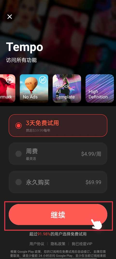 3、选择3天免费试用,然后点击下方的继续。